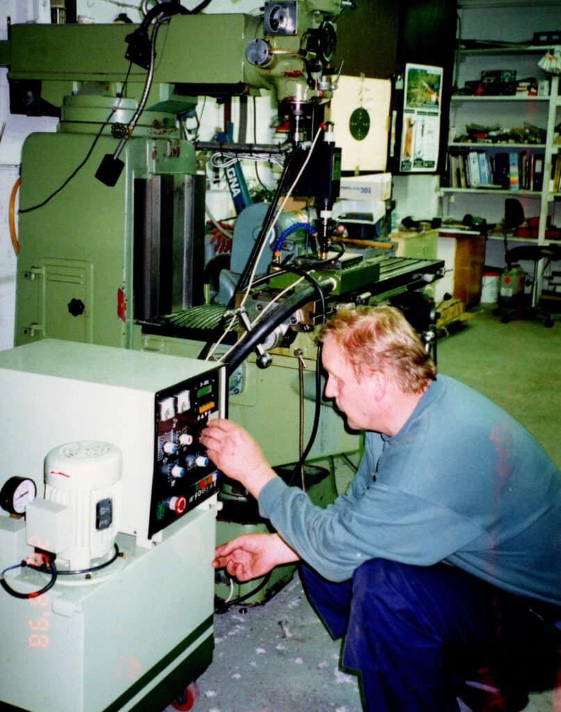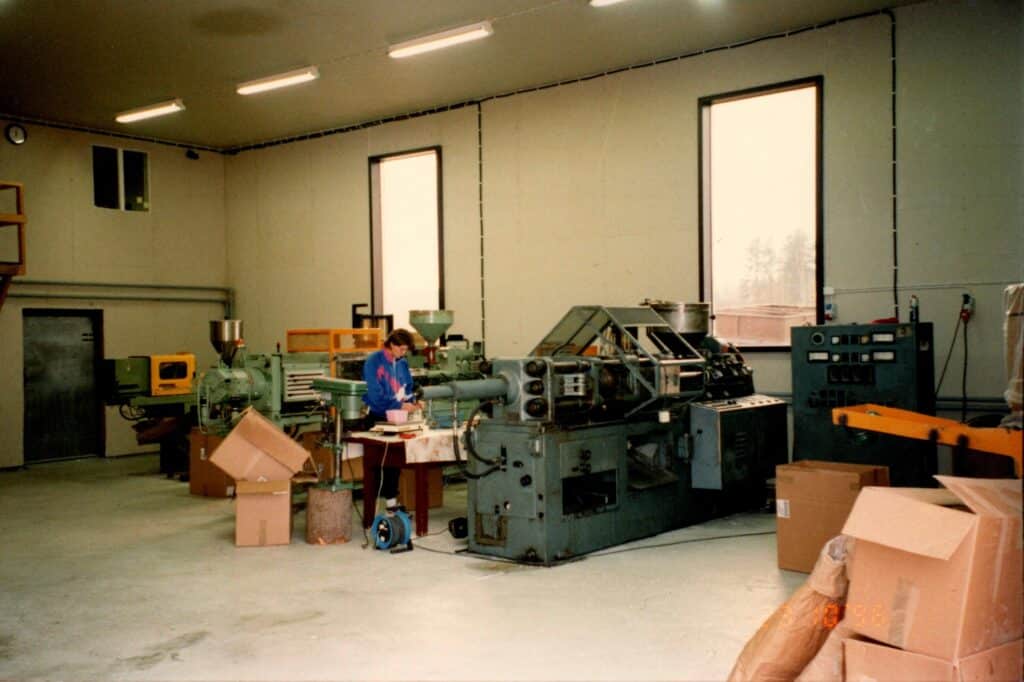 Aluksi yrityksessämme tehtiin pieniä tuotteita, kuten verhokoukkuja ja -liukuja, alihankintana muille yritykselle. Tehdas sijaitsi yrittäjien pihassa Vimpelin Pyhälahdessa lähellä Alajärven rajaa. 2000-luvun alussa toiminta alkoi laajentua: ensimmäinen työntekijä palkattiin, uusia koneita hankittiin ja oma muottivalmistus käynnistyi, oheisessa kuvassa jo eläköitynyt koneistajamme Jarmo työn touhussa.